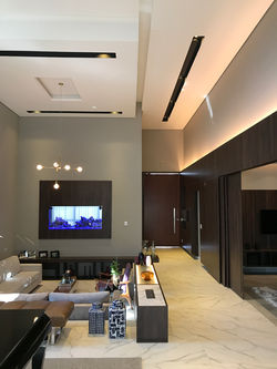 A empreitada oferecia inúmeros desafios: o primeiro projeto em uma casa, uma construção nova e iniciada por outro arquiteto, a maior e mais detalhada obra até então, em uma cidade distante 450 km da capital. O projeto fora concebido, discutido e aprimorado à distância com visitas em momentos chave do processo mas graças ao bom entrosamento com os amigos e clientes todos os obstáculos foram superados. Devido ao calor intenso na maior parte do ano na região e às grandes dimensões da residência utilizar piso frio e tons neutros foi uma das primeiras decisões tomadas. Branco nos pisos internos e externos e um belo cinza médio em todas as paredes e portas contrastam com o mobiliário feito sob medida em MDF madeirado de padrão mais escuro e detalhes em preto. A ausência de cores é dosada por toques pontuais de roxo e verde água, criando uma atmosfera agradavelmente fresca. Uma casa para (bem) receber, com espaços generosos e inúmeros pontos de interesse para serem apreciados de onde quer que se esteja. Projeto de iluminação: MM Iluminações.